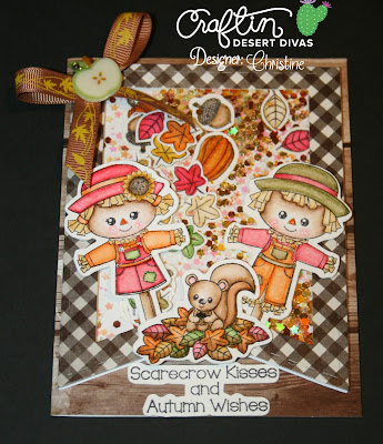 I colored my stamped images with Tim Holtz Distress Markers. The shaker part is made with glitter, stamped leaves, pumpkins, and acorns. I used some fall plaid paper for my shaker and some fall ribbon wit a apple in the center. I also stamped the sentiment in Memento Black Ink.