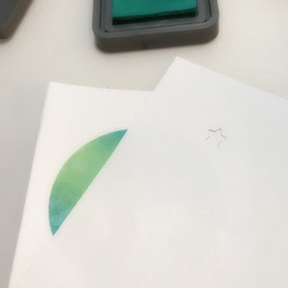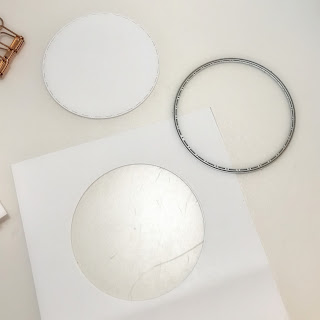 1) Cover the stamped image on the card stock with the post-it mask, then overlay the circle stencil over the image.