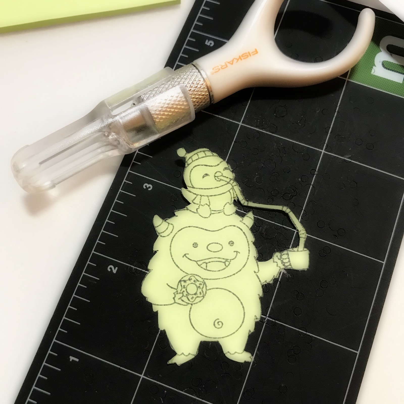 First, I stamped the image onto card stock. Then, I stamped the same image onto a post-it note to create a mask. I fussy cut the image on the post-it note using a swivel blade cutter.
