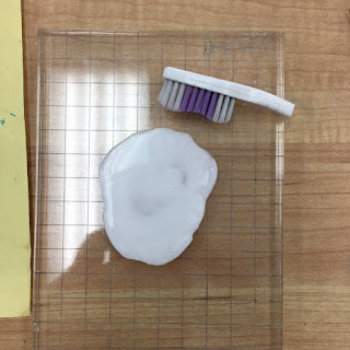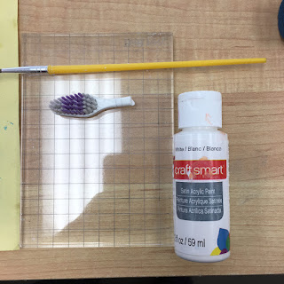 Next, I tried another method for ink/water splattering. I took out an acrylic block, small paint brush, toothbrush (please excuse the fact that I broke the toothbrush), and some white acrylic paint.