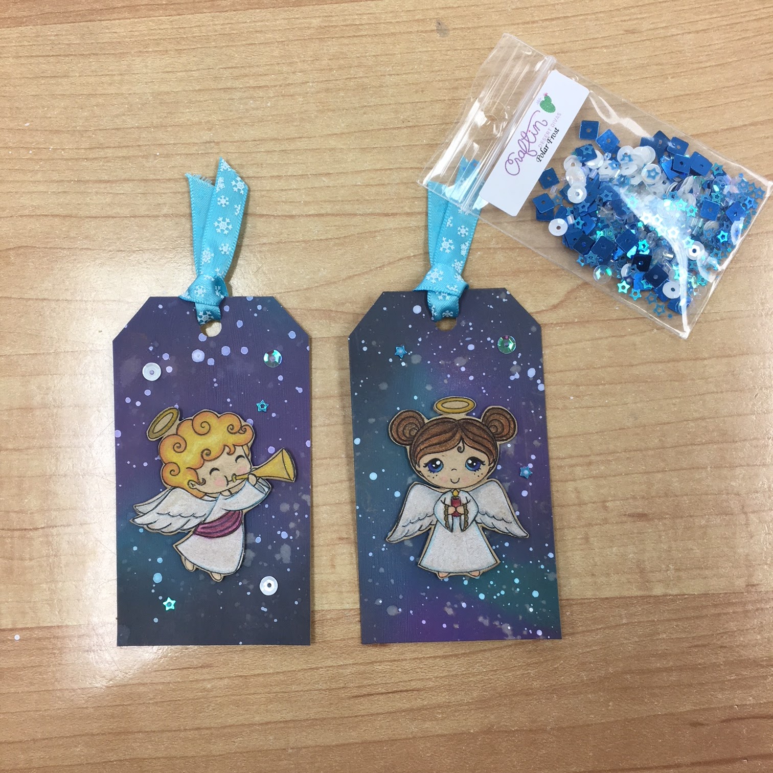 I thought it would be fun if my angel would fly around a bit so I originally taped a piece of thread to the back and suspended it by attaching the thread to the foam tape. In the end, my angel didn't have enough room to fly and kept getting stuck. So I removed the thread and adhered her to the tag with foam tape. After this was complete I filled the shaker with two snowflake jewels and sequins from the Polar Frost sequin mix.