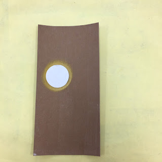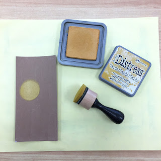 When I was finished blending the inks, I removed the circle mask from the center of the tag. As you can see, because the ink was not dry when I applied the mask, the ink left behind has a slight texture. I thought this was a cool effect, even though I hadn't planned for it and left it as is. If you don't like the texture, you can always go back over the circle with the Fossilized Amber ink and blend out the texture.
