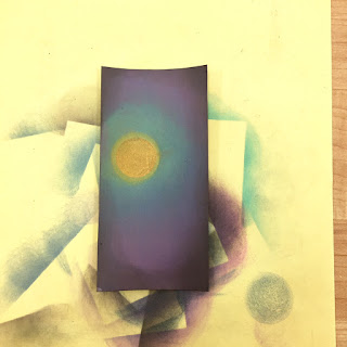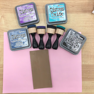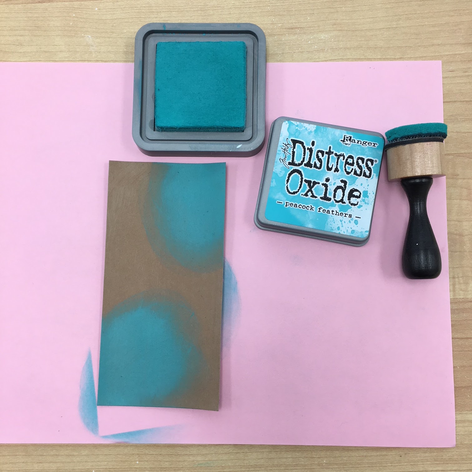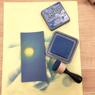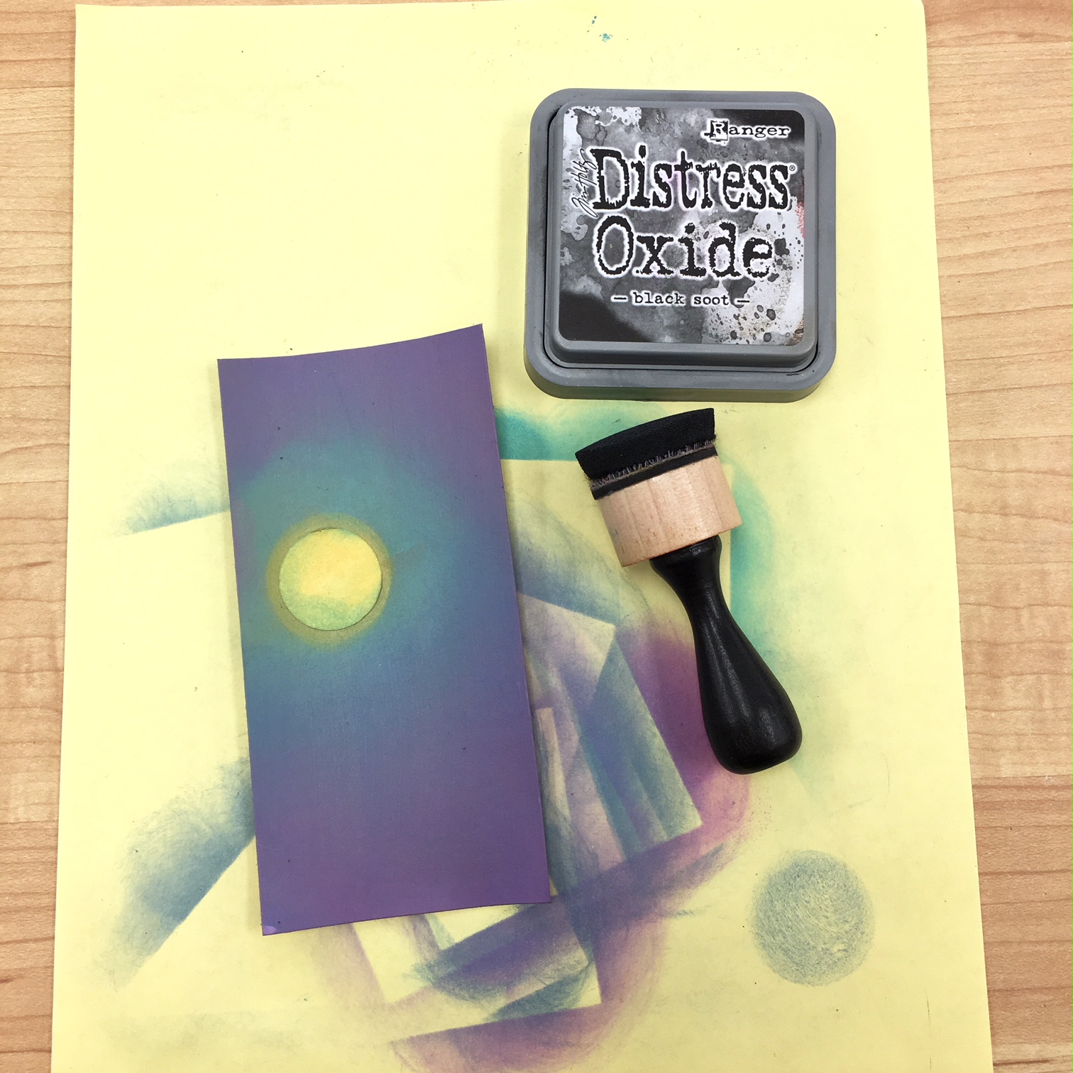 To protect the circle from some of the other ink colors, I covered it with a piece of sticker paper that I punched using a 1" circle punch. I did not heat set the ink before covering ink with the sticker paper, which helped it not stick too tightly to the tag. The using Broken China, Faded Jeans, Wilted Violet, and Black Soot Distress Oxide Inks I applied ink in a circular motion on the rest of the tag. I applied ink until I was happy with the overall color and blend.