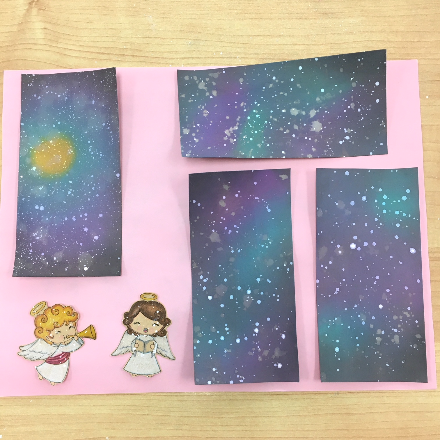 Ink blending and splatter complete. You can see my angels had some snow fall on their heads during the toothbrush fiasco.