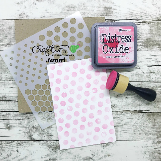 At first I colored up my background using Distress Oxide ‘Worn Lipstick’ and ‘Sorted Shapes 1’ stencil – If you love dots, you will love this stencil, trust me. I didn't use that much ink, because I wanted a soft look.