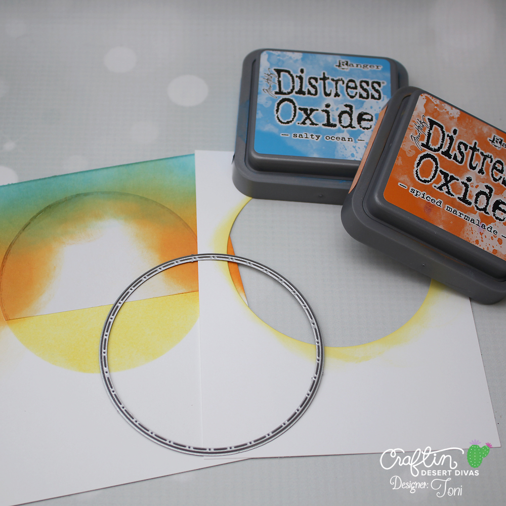 While the marbled cardstock was drying, I prepared the card base by creating a mask using a . I sponged the sun in yellow using the negative of the diecut then sponged the sunset in s. What a lovely surprise that orange and blue = green in this case! Notice I spattered water to break up the solid colors.