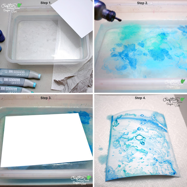 - Put on those gloves then drop alcohol ink randomly across the water. I used a combination of Adirondack Alcohol Ink and Copic Various Ink refills.