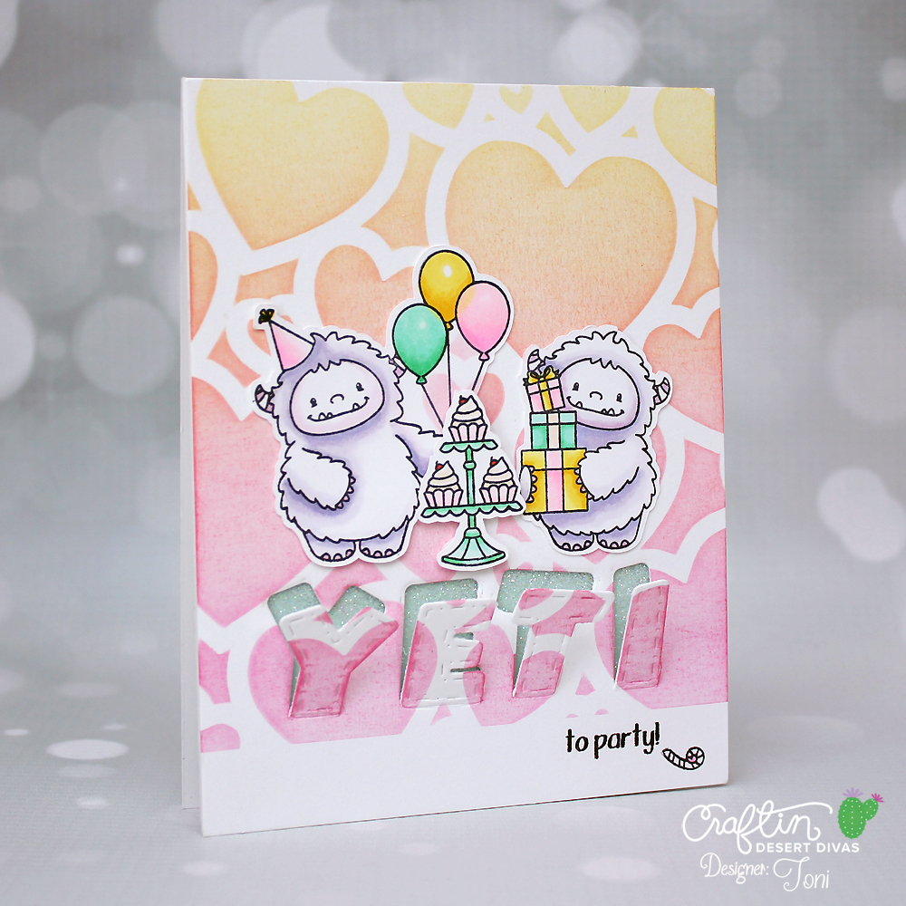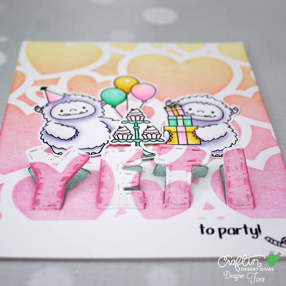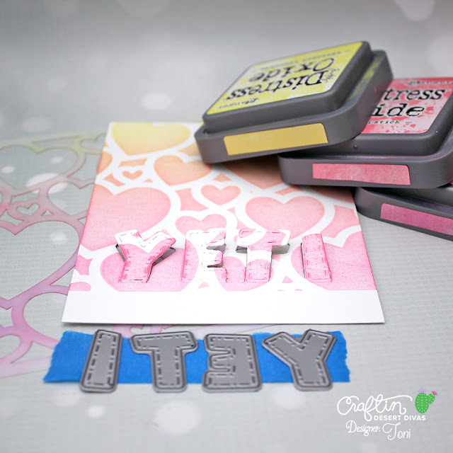 I started by masking the and then sponging with the , starting with . Notice how I overlap colors to create new colors and an even smoother transition? Love! I then diecut the . But, Toni! How did you get the word to stand up???