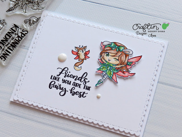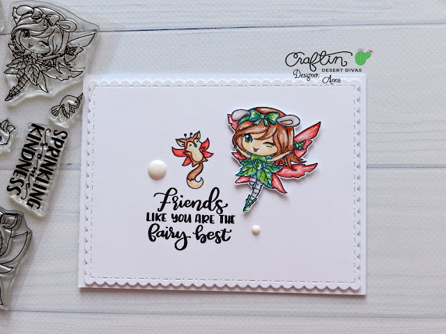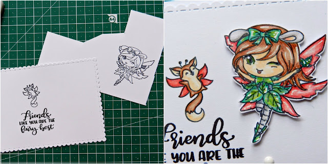 At first I decided to make it very simple but last minute decided that I want one of the images to pop so I stamped the sentiment and cute magic squirel (I think it is squirel, right? lol) right to the background & sweet fairy on the separate piece of card stock.