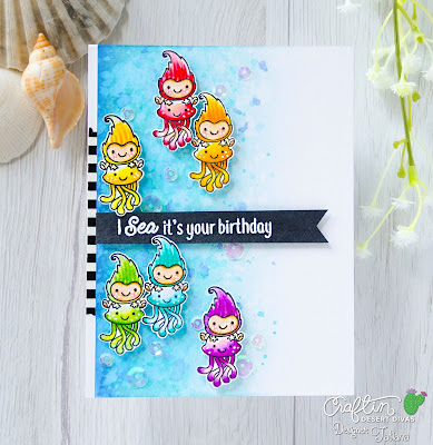Tatiana's underwater card is sharing our Fintastic Friend Stamps with those adorable Sprites and Jelly Fish. Love the rainbow of colors on them! Fintastic Friends are available today at 3pm EST.